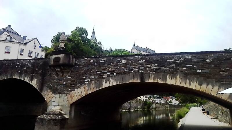 De Sûre loopt dwars door Vianden en de twee delen van de stad worden met elkaar verbonden door een brug waarop een standbeeld staat van H. Jan Nepomucenus, de beschermheilige van bruggen. We gaan nog even de stad in en komen langs Musée de Artistes en een kleine supermarkt. Hier doen we nog wat boodschappen waaronder een liter heerlijke witte wijn voor slechts € 1,85. Op de terugweg staat er in een stroomversnelling van de rivier een reiger heel geduldig te vissen. We lopen langs de camperplek en komen zo bij twee campings waar we even een kijkje nemen. We hebben een leuk rondje gelopen als we via een oude spoorbrug, die over de rivier loopt, weer terug komen bij de camper.