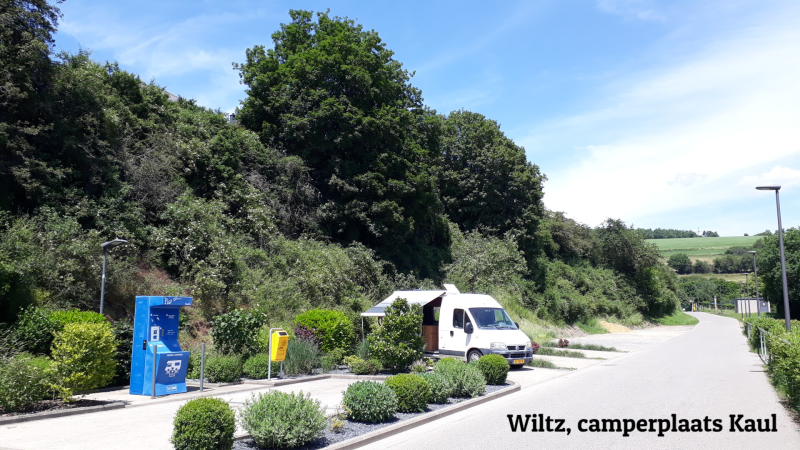 Na een nachtje aan de stroom gestaan te hebben en water ingenomen te hebben gaan we naar de gratis camperplaats Kaul in Wiltz. Het is een mooi aangelegde plek voor een camping met alleen een sanizuil voor € 1,00. Het ligt bij een zwembad en tegenover een skate – en fietspark.