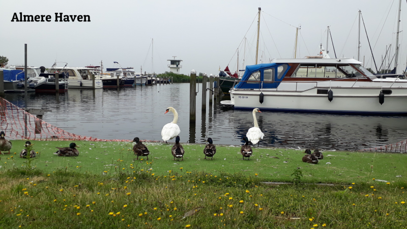 Dag 12 en 13: Vandaag rijden we door naar Almere Haven. Als we in de buurt zijn zien we opeens een kabelbaan met gondels over de snelweg gaan. De kabelbaan blijkt aangelegd te zijn voor de Floriade van 2022, is 850 meter lang en 35 meter hoog. In een 5 minuten durend ritje zweef je over het Floriadeterrein en de A6. We komen aan bij camperplek WSV Almere Haven, voor € 15,62 altijd weer een leuke plek met zicht op de bootjes. We zijn redelijk op tijd en dat is maar goed ook want al snel begint het vol te lopen. We hebben al snel gezelschap van een manke meerkoet.