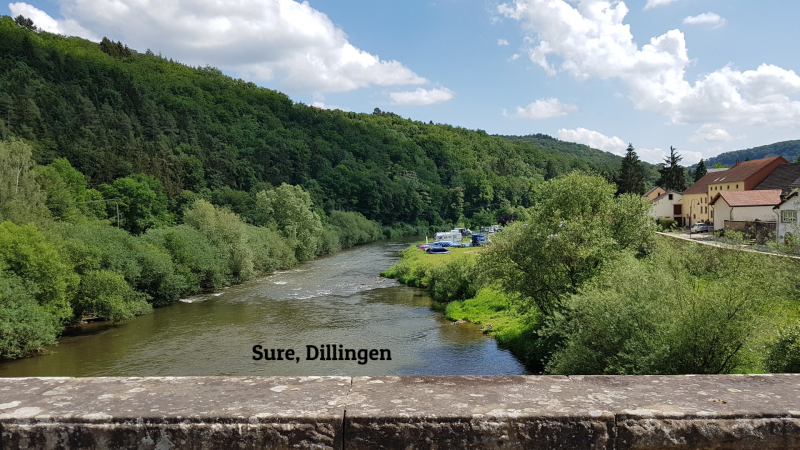 We blijven nog een nachtje in Dillingen en gaan vanmorgen eerst op de fiets naar het 6 km verderop gelegen Duitse Bollendorf. Het is een route die helemaal langs de Sûre gaat. Het is nog steeds mooi weer en nadat we gegeten hebben lopen we de brug over naar Duitsland.