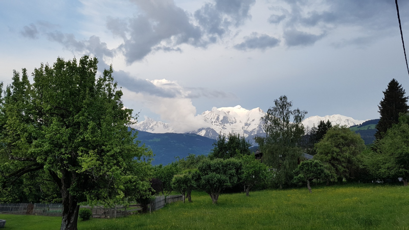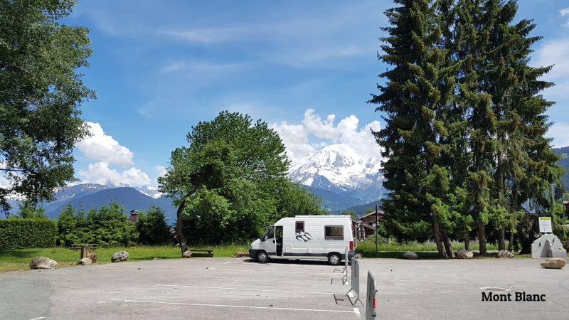 Het is mooi weer en we rijden verder door de Alpen naar parking du Bouchet in Combloux waar we een fantastisch zicht hebben op de Mont Blanc. Combloux is een oud, authentiek wintersportdorpje met veel chalets en een gezellig centrum waar zelfs nu voldoende te beleven is.