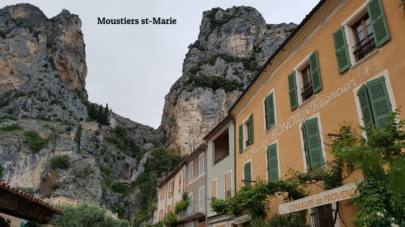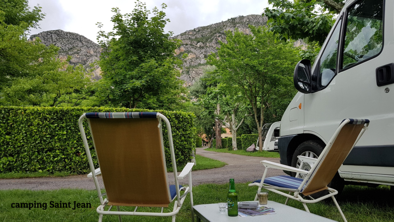 Als we op een hele smalle weg hebben weten te keren rijden we via de snelweg door naar Moustiers st-Marie. Op loopafstand van het historische stadje staan we op camping Saint Jean waar we mooi zicht op de bergen hebben. Het ligt in natuurpark Gorges du Verdon.