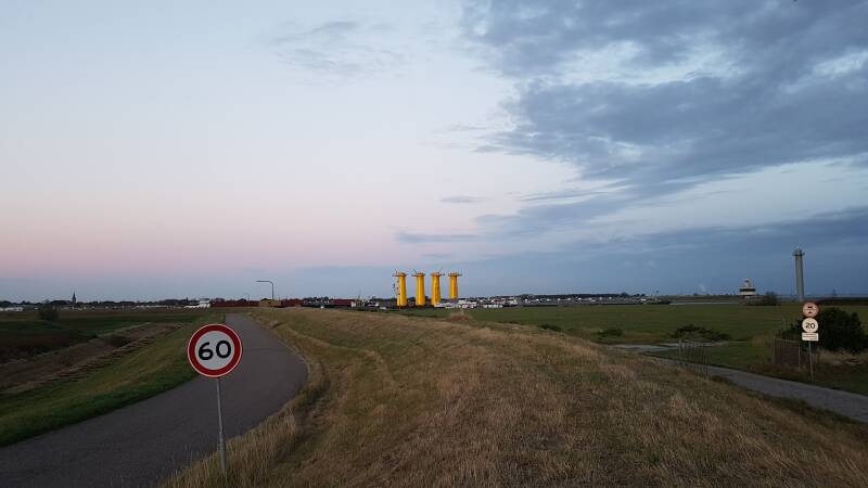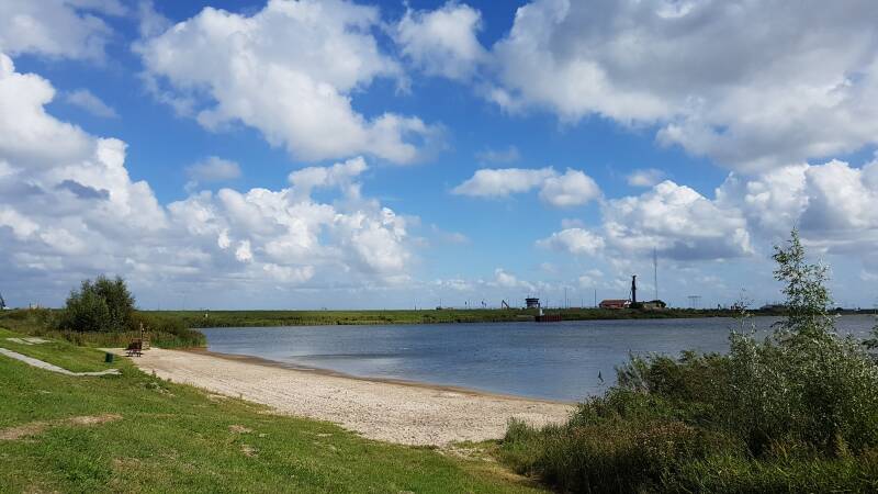 Op de terugweg nemen we lekker verse kibbeling mee voor vanavond. Na het eten lopen we naar de Afsluitdijk die in 1932 de Zuiderzee (sindsdien IJsselmeer) scheidde van de Waddenzee. Normaal gesproken kun je via een hek de dijk op maar helaas is dit in verband met corona nu niet mogelijk. De Stevinsluizen zijn gebouwd om het zoete IJsselmeerwater naar zee af te voeren en voor de scheepvaart werd een schutsluis gebouwd. Langs het water lopen we door tot de binnenhaven en vanaf hier kunnen we zien hoe aan de overkant de campers staan.