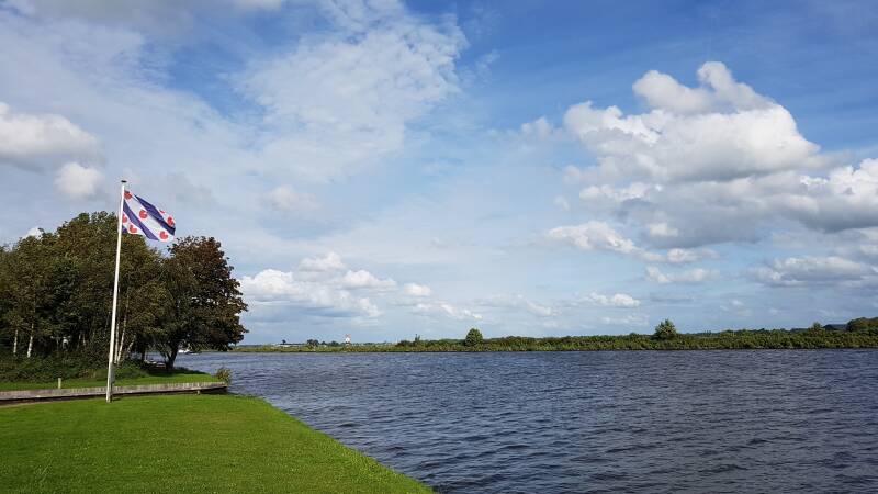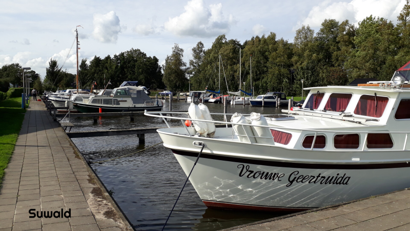 Het weer is opgeklaard en op ons gemak gaan we langs bij kringloopwinkels in Beilen, Appelscha, Oosterwolde en Drachten. In Appelscha zit ook een servicestation voor campers waar we gebruik van maken. In Drachten zouden we dan nog een nachtje gratis kunnen staan maar we rijden toch maar door naar de jachthaven in Suwâld. Het is een goede plek aan het Prinses Margrietkanaal al is de prijs met € 12,50 stageld, € 2,00 stroom en € 1,00 douchen per persoon wel wat aan de hoge kant. Suwâld ligt tussen Leeuwarden en Bergum op de rand van de Friese Wouden. Het dorp heeft het eerste fiets-en-voetveer op zonne-energie ter wereld, de zonnepont Schalkediep. Het is de veerdienst over het Prinses Margrietkanaal naar Garijp en vlak bij de afvaart is een kiosk met terras en jachthaven. Achteraf hebben we spijt dat we toch niet in Drachten zijn gebleven.
