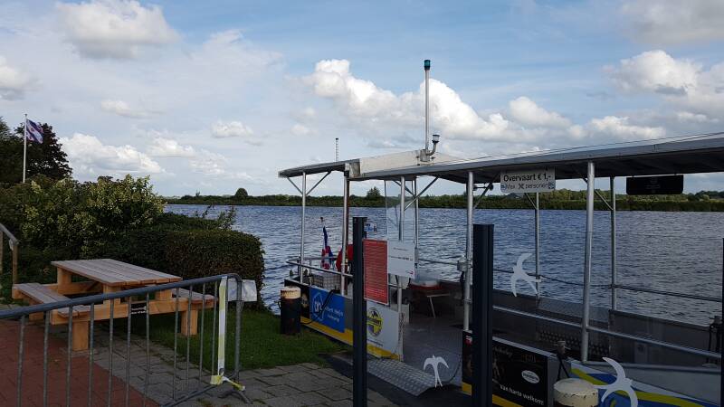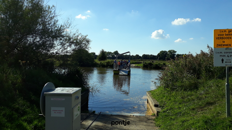 Op de terugweg willen we een kortere route nemen door met het pontje de vecht over te steken. Het is gratis en fietsers en voetgangers kunnen de elektrische voet- en fietsveer zelf bedienen. Het is er druk en er mogen maar 4 personen per keer mee. Na een half uur wachten mogen we aan boord en kunnen we heel langzaam naar de overkant. Heel leuk om een keer mee te maken. Daarna zijn we snel weer bij de camper en hebben we in totaal ongeveer 15 km gefietst.