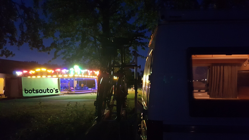 Vlak bij onze camper staan botsauto's maar het lijkt erop dat ze nog aan het opbouwen zijn of elk moment kunnen opbreken. Geen van beide is het geval want rond 17.00 uur gaan de autootjes rijden met daarbij de nodige harde muziek. Het is er niet erg druk maar waarschijnlijk heeft dat te maken de storm die op komst is. We hebben vanmorgen beenham gekocht en met wat aardappeltjes en sla smaakt het prima. Bij de koffie hebben we een lekkere Zeeuwse bolus.