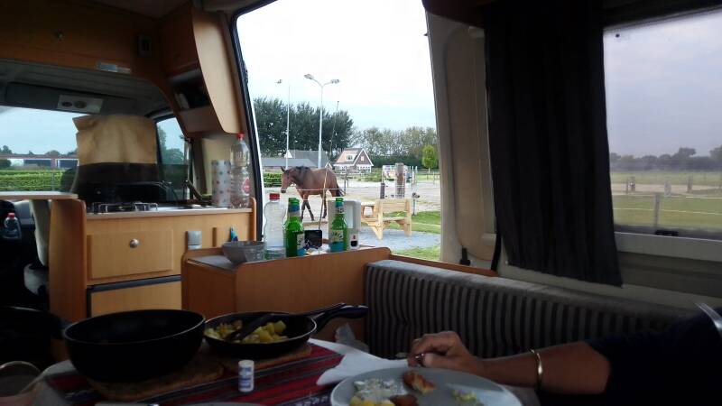 Daarna rijden we door naar de familie Stoop in de Rijp waar we voor € 7,00 een mooi plekje hebben op het boerenerf.