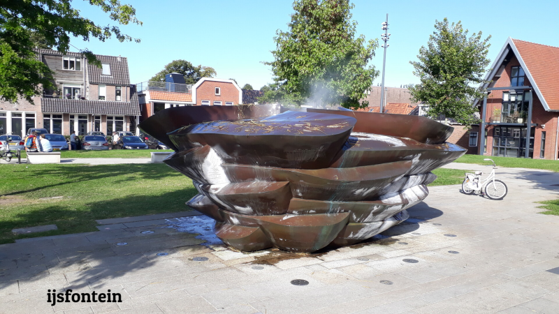 Op de markt staat de IJsfontein, één van de elf fonteinen die in 2018 zijn geplaatst omdat Leeuwarden dat jaar de culturele hoofdstad van Europa is. Het is heerlijk weer en we hebben stroom dus kunnen we op ons eigen terrasje de platenspeler even uitproberen.