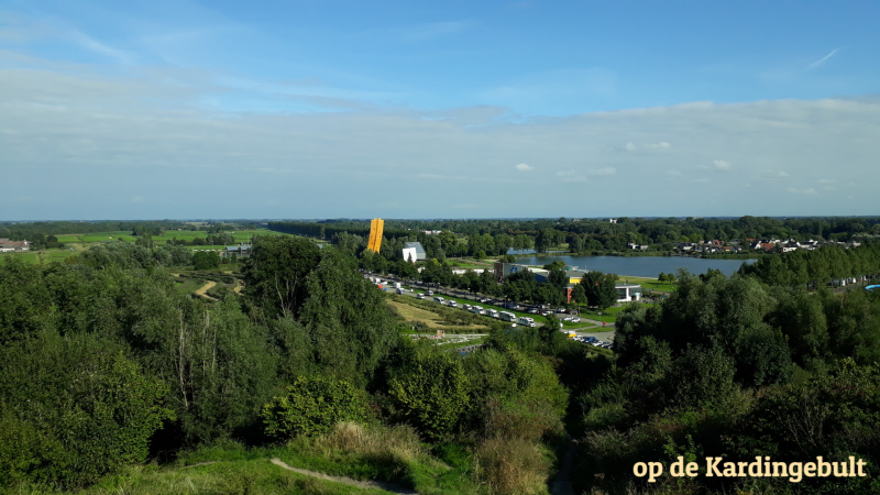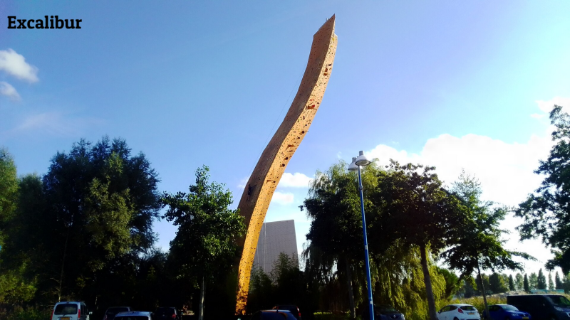 We zien ook een hoog geel gevaarte staan. Door de opvallende kleur en gebogen vorm lijkt de toren net een mislukte banaan en wordt daarom “de Kromme Gele” genoemd. Als we later een stuk gefietst hebben en dichterbij komen, zien we wat het in werkelijkheid is: een spectaculaire uit het lood hangende klimwand. De officiële naam is Excalibur. De klimwand weegt zo'n 40 ton, is 37 meter hoog en hangt 11 meter uit het lood. Aan weerszijden zijn 8 klimroutes uitgezet. Bizar om te zien dat er mensen tot bovenaan geklommen zijn. Voor de beginnende klimmer zijn er ook lagere rotsen waar je kunt oefenen.